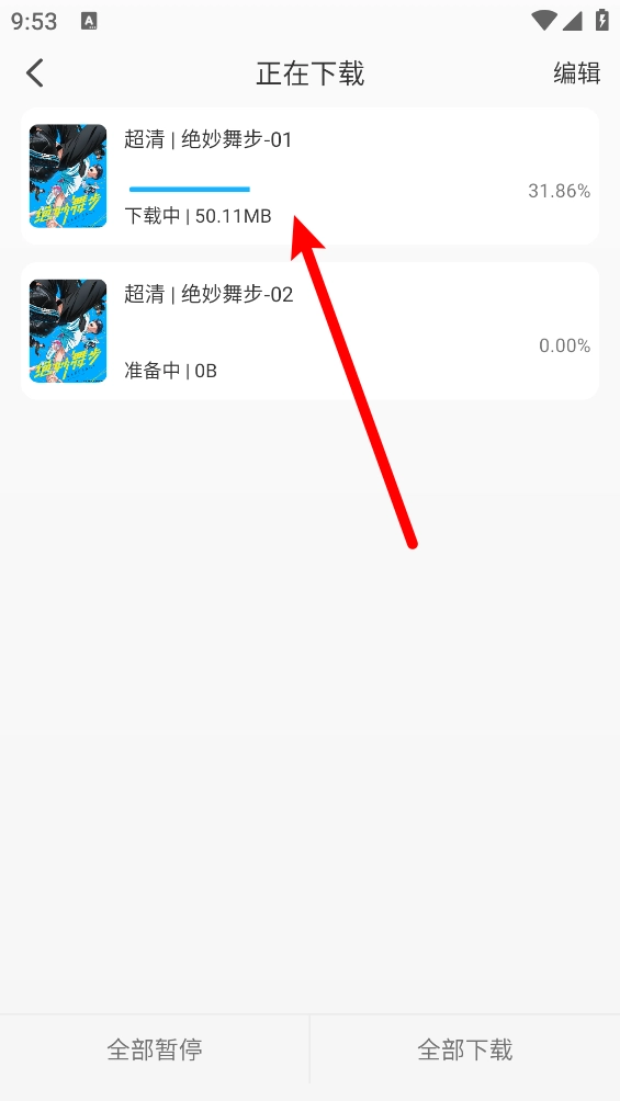 4、返回首页右上角点击下载图标,查看进度和管理文件。