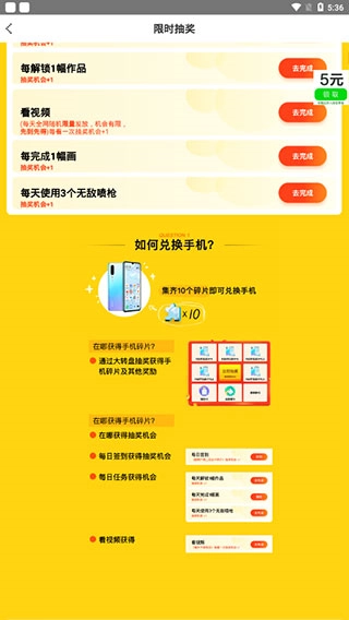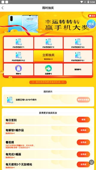 5. 点击右上角抽奖活动,赢取华为手机等实物奖品;