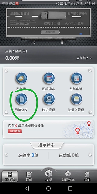 货主登录工作台点击“回单签收”,勾选待处理运单。