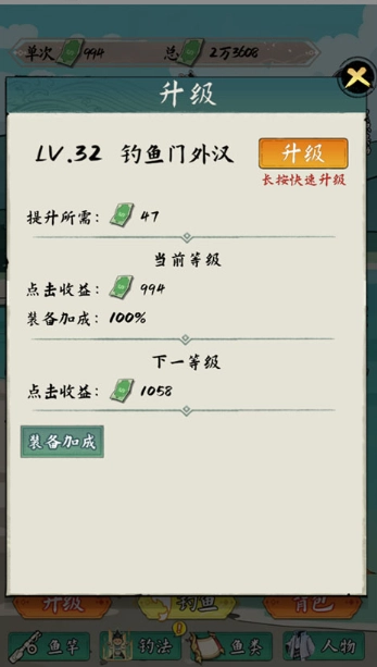 6、积累的钱币用于升级钓具技能,助力挑战更珍稀的鱼王。