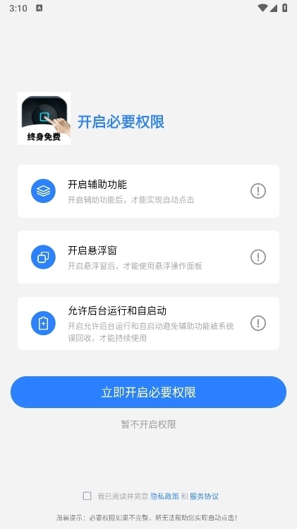 1. 权限配置:首次启用需开启无障碍服务,部分机型需单独设置悬浮窗权限;