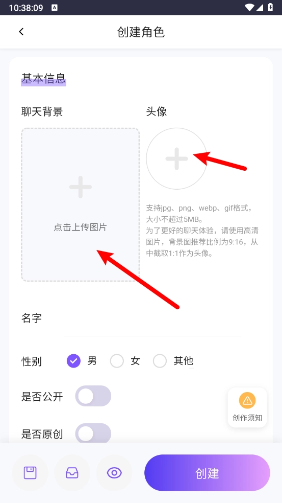 上传角色头像图片,输入名称、年龄和简短背景描述。