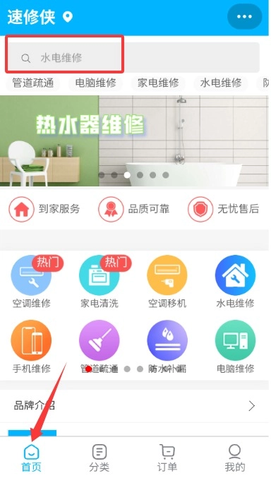 2、在首页搜索栏输入维修类型关键词,系统将智能匹配相关服务项目及附近师傅。